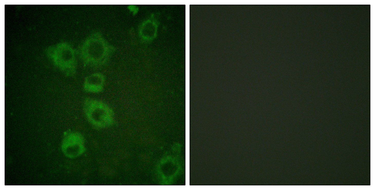 Immunofluorescence analysis of HUVEC cells, using Caspase 6 Antibody. The picture on the right is blocked with the synthesized peptide.