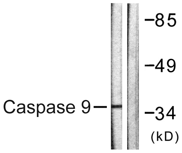 Western blot analysis of lysates from HeLa cells, treated with EGF 200ng/ml 30', using Caspase 9 Antibody. The lane on the right is blocked with the synthesized peptide.