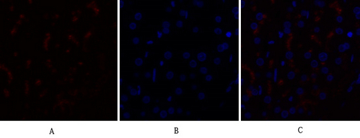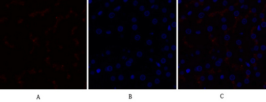 Immunofluorescence analysis of human-liver tissue. 1,Caspase-9 Polyclonal Antibody(red) was diluted at 1:200(4°C,overnight). 2, Cy3 labled Secondary antibody was diluted at 1:300(room temperature, 50min).3, Picture B: DAPI(blue) 10min. Picture A:Target. Picture B: DAPI. Picture C: merge of A+B