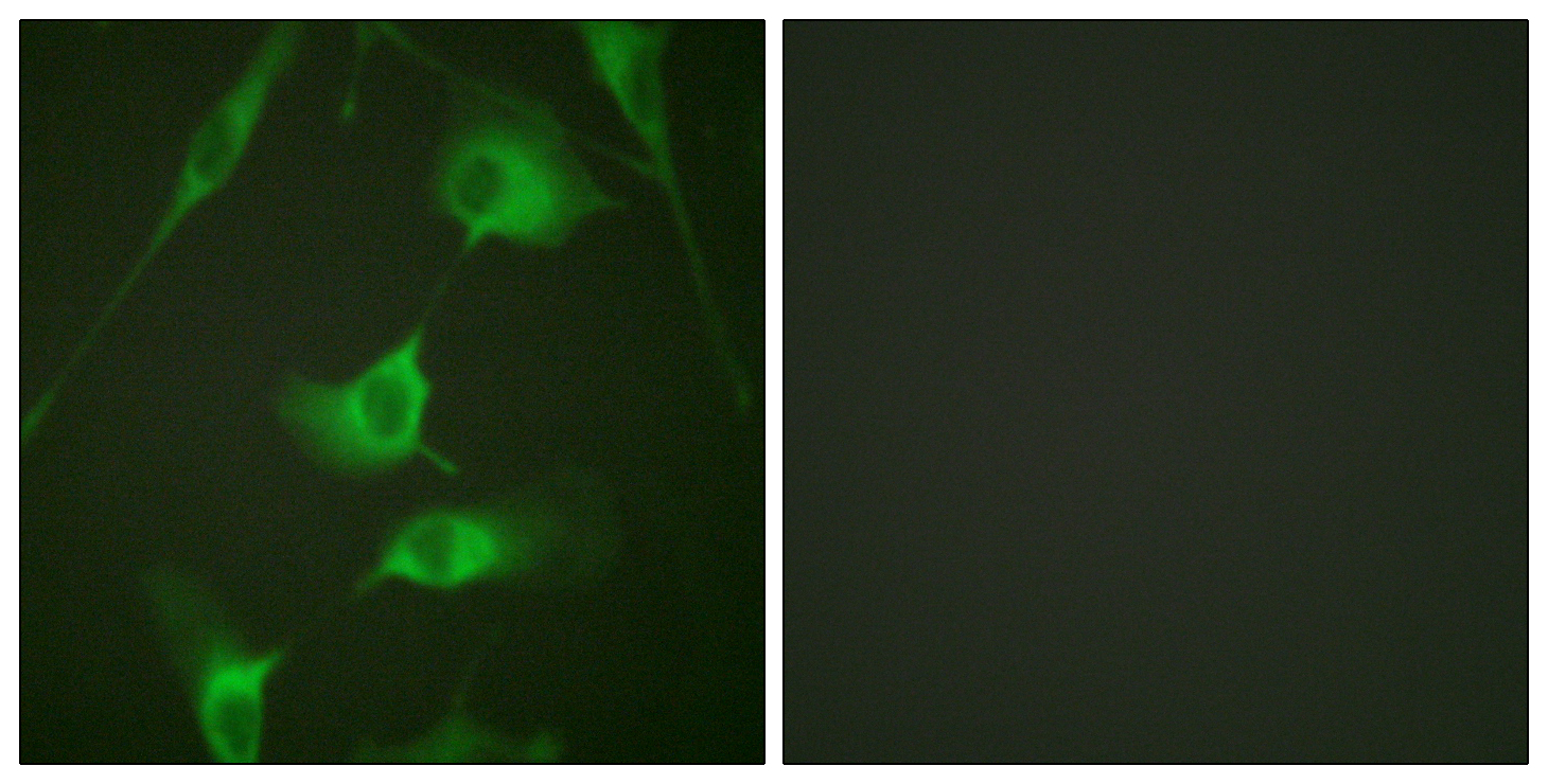 Immunofluorescence analysis of HeLa cells, using Keratin 8 Antibody. The picture on the right is blocked with the synthesized peptide.