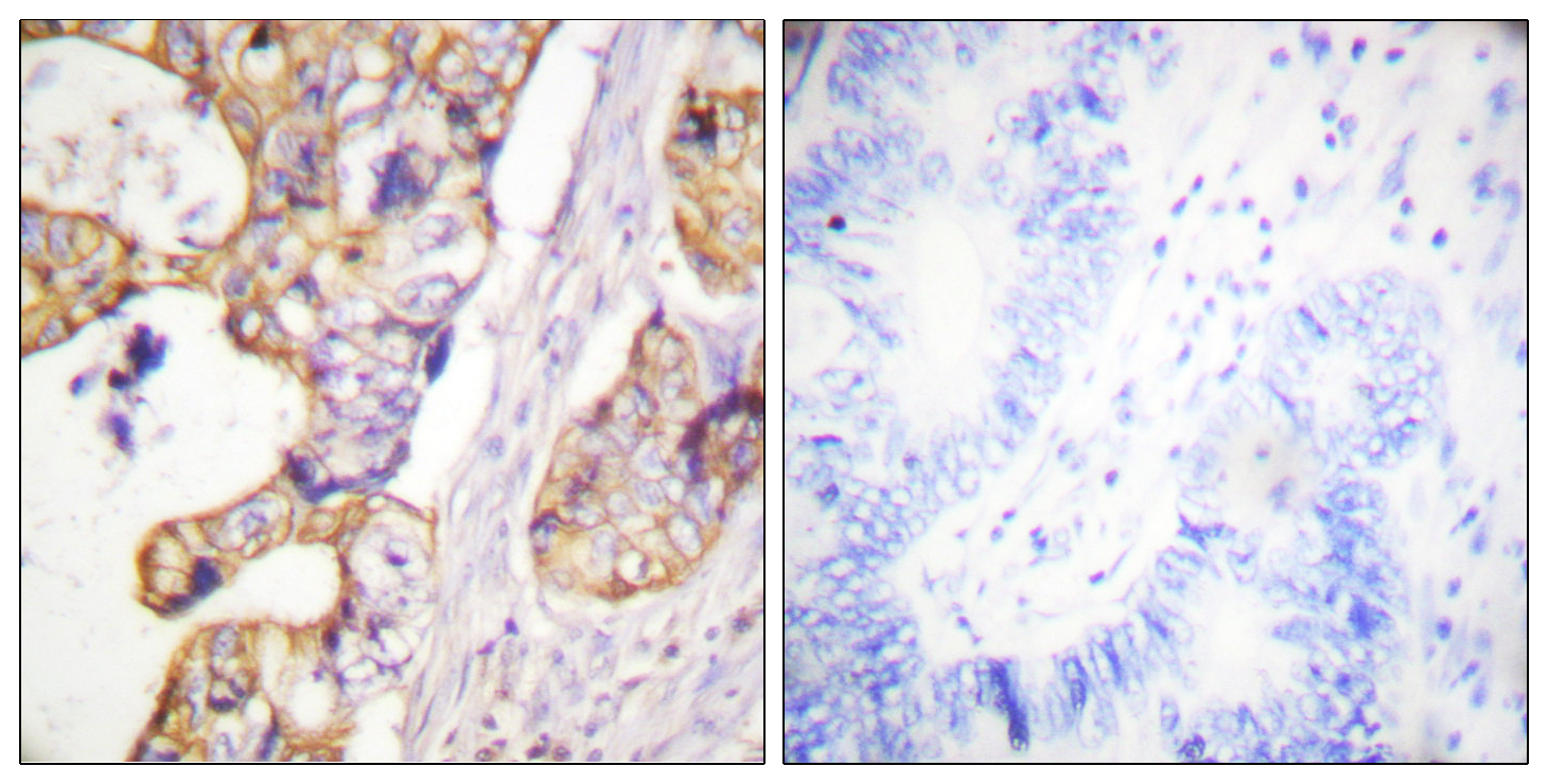 Immunohistochemistry analysis of paraffin-embedded human colon carcinoma tissue, using Keratin 8 Antibody. The picture on the right is blocked with the synthesized peptide.