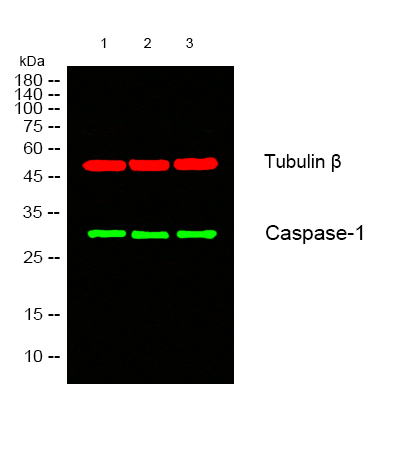 Western blot analysis of lysates from 1) 293, 2) MCF-7, 3) HeLa cells, (Green) primary antibody was diluted at 1:1000, 4°over night, secondary antibody(cat:SA0439)was diluted at 1:10000, 37° 1hour. (Red) Tubulin β Monoclonal Antibody(5G3) (cat:N1294) antibody was diluted at 1:5000 as loading control, 4° over night,secondary antibody(cat:SA0436)was diluted at 1:10000, 37° 1hour.