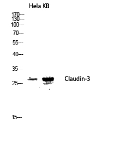 Western blot analysis of Hela KB lysis using Claudin-3 antibody. Antibody was diluted at 1:2000