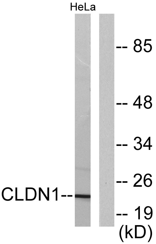 Western blot analysis of lysates from HeLa cells, using Claudin 1 Antibody. The lane on the right is blocked with the synthesized peptide.