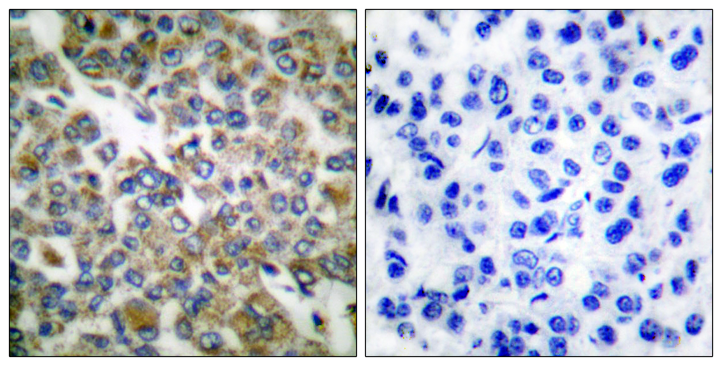 Immunohistochemistry analysis of paraffin-embedded human breast carcinoma tissue, using Keratin 14 Antibody. The picture on the right is blocked with the synthesized peptide.