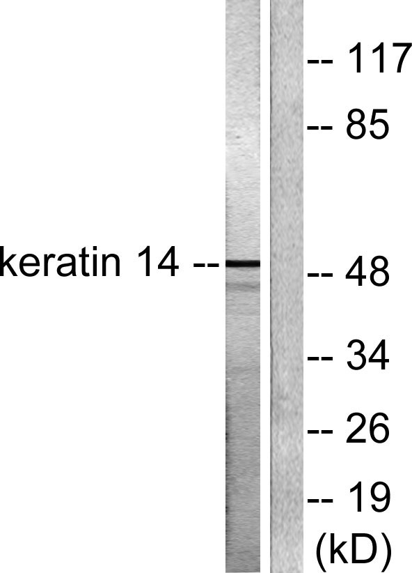 Western blot analysis of lysates from NIH/3T3 cells, using Keratin 14 Antibody. The lane on the right is blocked with the synthesized peptide.