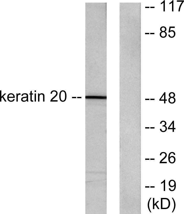 Western blot analysis of lysates from HeLa cells, using Keratin 20 Antibody. The lane on the right is blocked with the synthesized peptide.