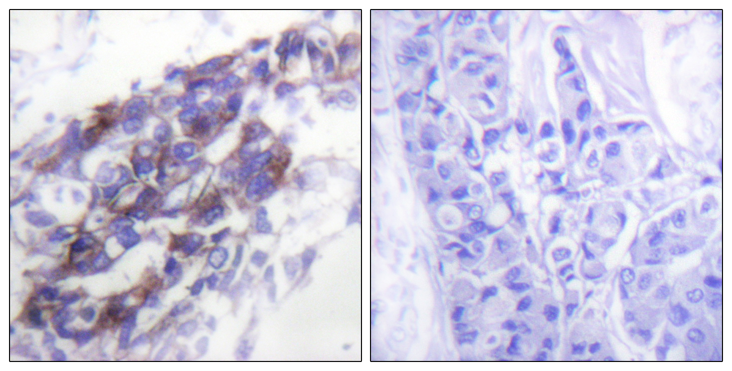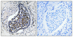 Immunohistochemistry analysis of paraffin-embedded human breast carcinoma tissue, using Keratin 8 Antibody. The picture on the right is blocked with the synthesized peptide.