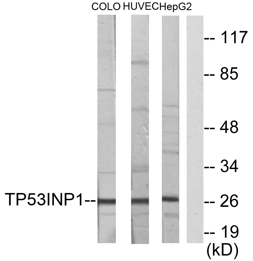 Western blot analysis of lysates from COLO205, HUVEC, and HepG2 cells, using TP53INP1 Antibody. The lane on the right is blocked with the synthesized peptide.