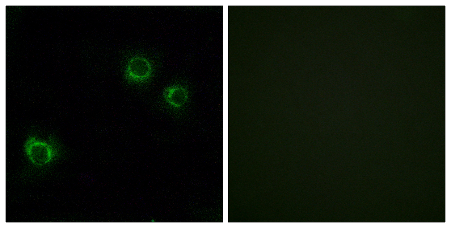 Immunofluorescence analysis of HUVEC cells, using CLDN6 Antibody. The picture on the right is blocked with the synthesized peptide.