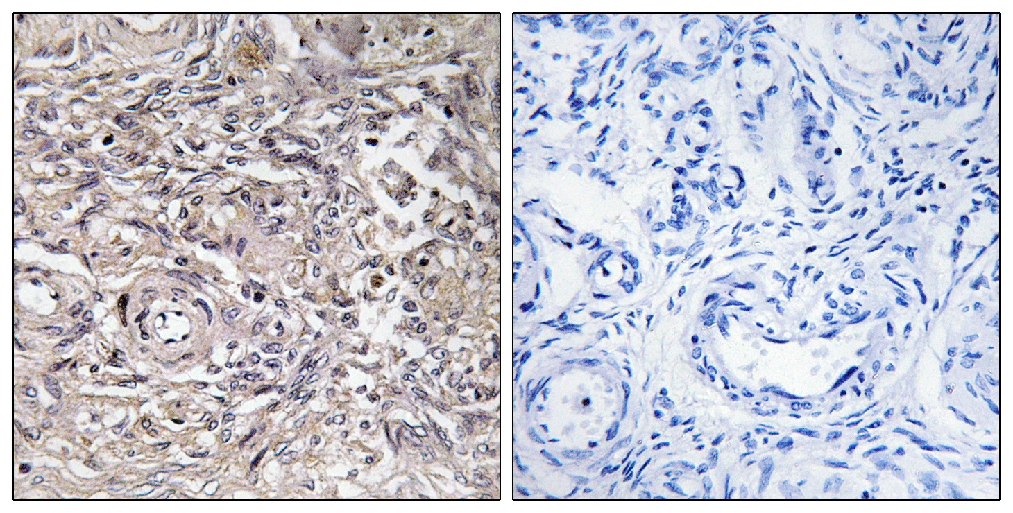 Immunohistochemistry analysis of paraffin-embedded human ovary tissue, using CLDN6 Antibody. The picture on the right is blocked with the synthesized peptide.