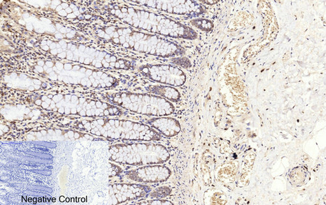 Immunohistochemical analysis of paraffin-embedded Human-colon tissue. 1,Cleaved-Caspase-3 p17 (D175) Polyclonal Antibody was diluted at 1:200(4°C,overnight). 2, Sodium citrate pH 6.0 was used for antibody retrieval(>98°C,20min). 3,Secondary antibody was diluted at 1:200(room tempeRature, 30min). Negative control was used by secondary antibody only.