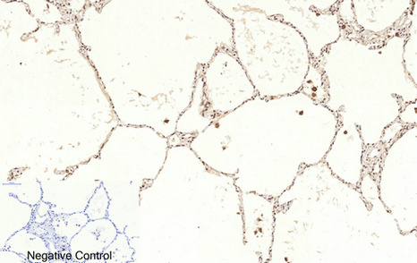 Immunohistochemical analysis of paraffin-embedded Human-lung tissue. 1,Cleaved-Caspase-3 p17 (D175) Polyclonal Antibody was diluted at 1:200(4°C,overnight). 2, Sodium citrate pH 6.0 was used for antibody retrieval(>98°C,20min). 3,Secondary antibody was diluted at 1:200(room tempeRature, 30min). Negative control was used by secondary antibody only.