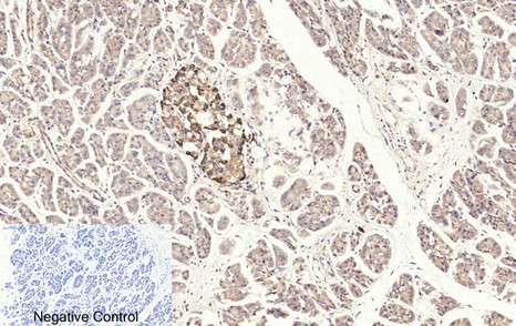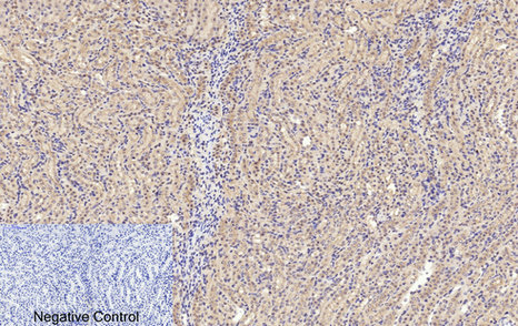 Immunohistochemical analysis of paraffin-embedded Mouse-kidney tissue. 1,Cleaved-Caspase-3 p17 (D175) Polyclonal Antibody was diluted at 1:200(4°C,overnight). 2, Sodium citrate pH 6.0 was used for antibody retrieval(>98°C,20min). 3,Secondary antibody was diluted at 1:200(room tempeRature, 30min). Negative control was used by secondary antibody only.