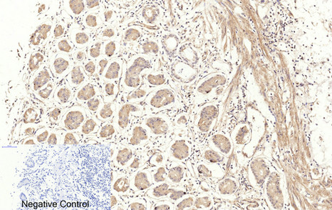 Immunohistochemical analysis of paraffin-embedded Human-stomach tissue. 1,Cleaved-Caspase-3 p17 (D175) Polyclonal Antibody was diluted at 1:200(4°C,overnight). 2, Sodium citrate pH 6.0 was used for antibody retrieval(>98°C,20min). 3,Secondary antibody was diluted at 1:200(room tempeRature, 30min). Negative control was used by secondary antibody only.