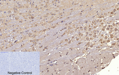Immunohistochemical analysis of paraffin-embedded Mouse-brain tissue. 1,Cleaved-Caspase-3 p17 (D175) Polyclonal Antibody was diluted at 1:200(4°C,overnight). 2, Sodium citrate pH 6.0 was used for antibody retrieval(>98°C,20min). 3,Secondary antibody was diluted at 1:200(room tempeRature, 30min). Negative control was used by secondary antibody only.
