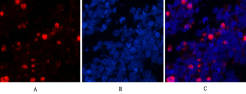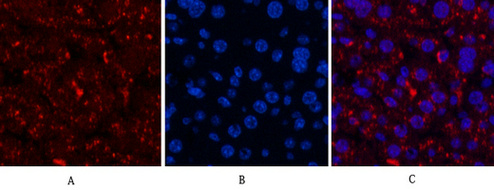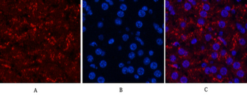 Immunofluorescence analysis of Mouse-liver tissue. 1,Cleaved-Caspase-3 p17 (D175) Polyclonal Antibody(red) was diluted at 1:200(4°C,overnight). 2, Cy3 labled Secondary antibody was diluted at 1:300(room temperature, 50min).3, Picture B: DAPI(blue) 10min. Picture A:Target. Picture B: DAPI. Picture C: merge of A+B