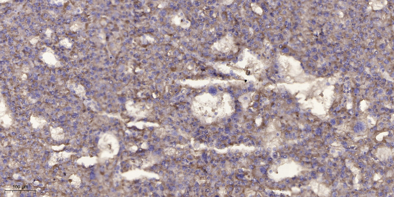 Immunohistochemical analysis of paraffin-embedded human liver cancer. 1, Antibody was diluted at 1:200(4° overnight). 2, Tris-EDTA,pH9.0 was used for antigen retrieval. 3,Secondary antibody was diluted at 1:200(room temperature, 45min).