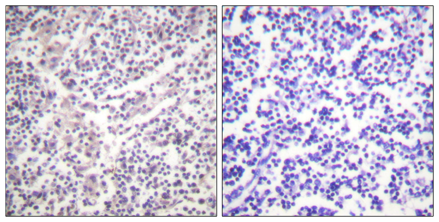 Immunohistochemistry analysis of paraffin-embedded human lymph node, using Caspase 3 (Phospho-Ser150) Antibody. The picture on the right is blocked with the phospho peptide.