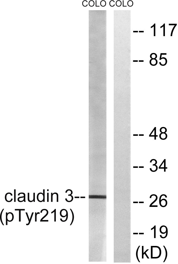 Western blot analysis of lysates from COLO205 cells treated with EGF 200ng/ml 30', using Claudin 3 (Phospho-Tyr219) Antibody. The lane on the right is blocked with the phospho peptide.