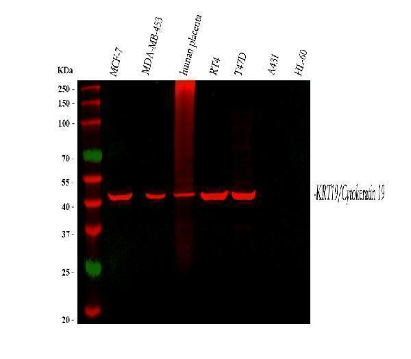 Figure 1. Western blot analysis of Cytokeratin 19 using anti-Cytokeratin 19 antibody (PA1335). Electrophoresis was performed on a 5-20% SDS-PAGE gel at 70V (Stacking gel) / 90V (Resolving gel) for 2-3 hours. The sample well of each lane was loaded with 30 ug of sample under reducing conditions. Lane 1: human MCF-7 whole cell lysates, Lane 2: human MDA-MB-453 whole cell lysates, Lane 3: human placenta tissue lysates, Lane 4: human RT4 whole cell lysates, Lane 5: human T-47D whole cell lysates, Lane 6: human A431 whole cell lysates, Lane 7: human HL-60 whole cell lysates. After electrophoresis, proteins were transferred to a nitrocellulose membrane at 150 mA for 50-90 minutes. Blocked the membrane with 5% non-fat milk/TBS for 1.5 hour at RT. The membrane was incubated with rabbit anti-Cytokeratin 19 antigen affinity purified polyclonal antibody (Catalog # PA1335) at 0.5 μg/mL overnight at 4°C, then washed with TBS-0.1%Tween 3 times with 5 minutes each and probed with a goat anti-rabbit IgG-DyLight 647 Conjugated secondary antibody at a dilution of 1:5000 for 1.5 hour at RT. A specific band was detected for Cytokeratin 19 at approximately 44 kDa. The expected band size for Cytokeratin 19 is at 44 kDa.