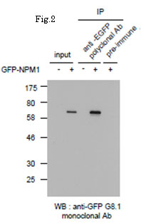 Fig.2 Immunoprecipitation of GFP-tagged protein with this antibody followed by Western blotting. -: Lysate of 293T cells transfected with an empty vector +: Lysate of 293T cells transfected with the plasmid carrying the GFP-tagged NPM1 gene