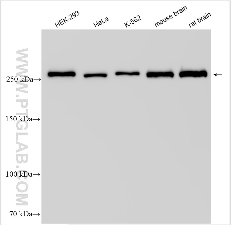 The USP9X antibody from Proteintech is a rabbit polyclonal antibody to a peptide of human USP9X. This antibody recognizes human, mouse, rat antigen. The USP9X antibody has been validated for the following applications: WB, IHC, IF/ICC, FC (Intra), IP, ELISA analysis.
