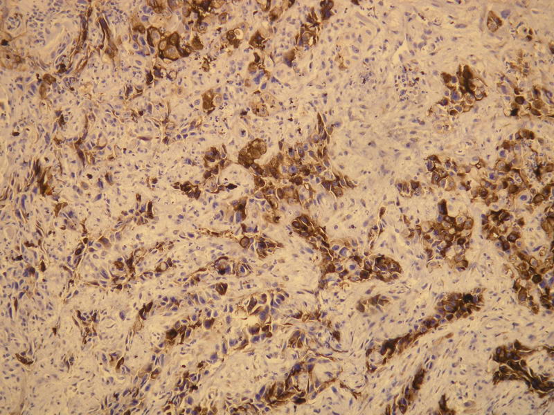 Anti-EMA antibody is a useful marker for staining several types of carcinomas. It stains normal and neoplastic cells from various tissues, including mammary epithelium, sweat glands and squamous epithelium. Hepatocellular carcinoma, adrenal carcinoma and embryonal carcinomas are consistently EMA negative, so keratin positivity with negative EMA favors one of these tumors. EMA is frequently positive in meningiomas, breast, ovary, lung and prostate tumors.