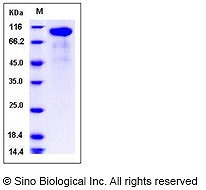 calculated molecular mass: 70.6 kDa SDS-PAGE under reducing conditions: 95-105 kDa