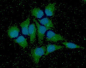 ICC/IF analysis of EGFR in HeLa cells line, stained with DAPI (Blue) for nucleus staining and monoclonal anti-human EGFR antibody (1:100) with goat anti-mouse IgG-Alexa fluor 488 conjugate (Green).