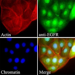 Immunofluorescence of HaCaT cells stained with Hoechst 3342 (Blue) or phalloidin-TRITC for nucleus or actin staining, respectably. monoclonal anti-human EGFR antibody (1:250) was stained with alexa 488 (green).