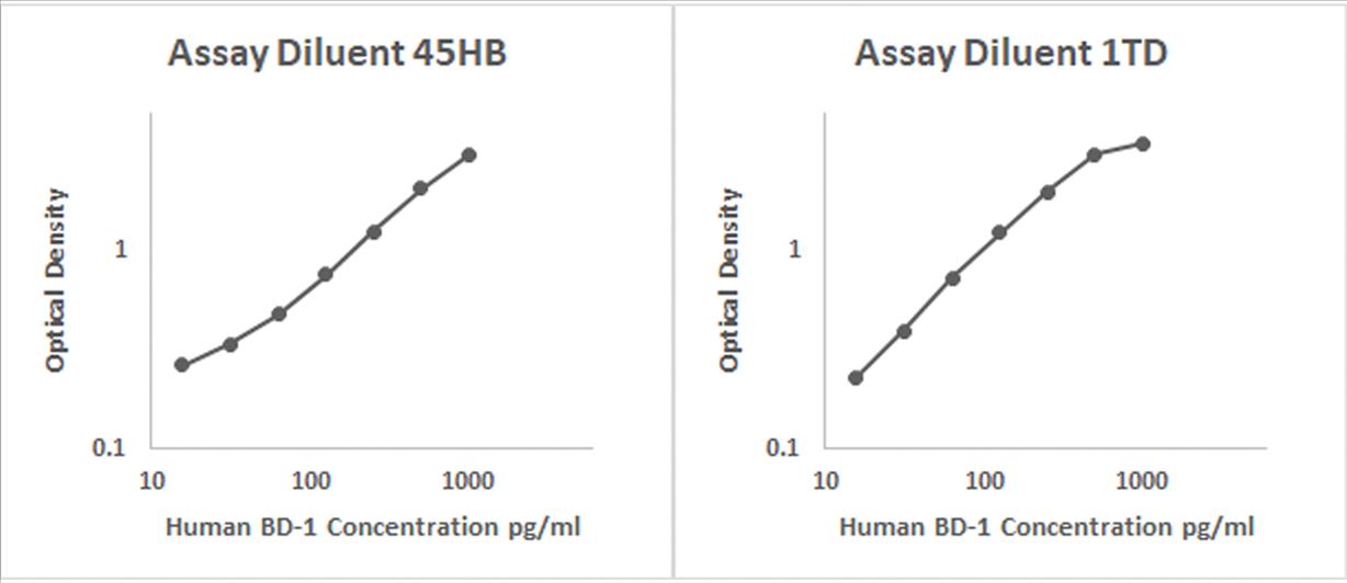 Human BD-1 recombinant protein was spiked into various biological samples and serial diluted with Assay Diluent 45HB for serum and/or plasma samples and Assay Diluent 1TD for RPMI 10% FBS.