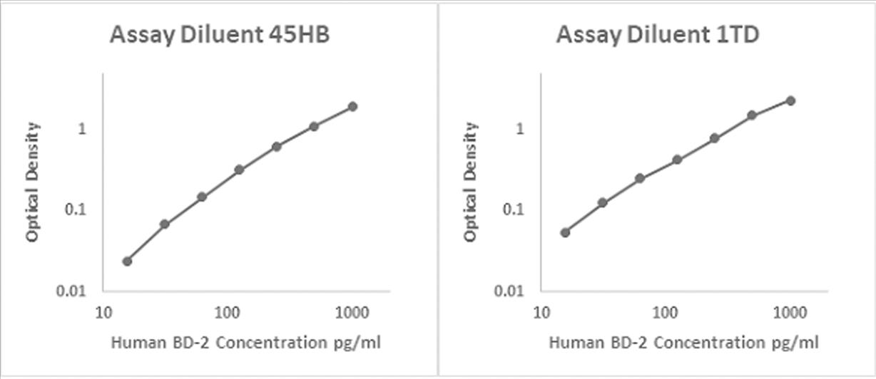 Human BD-2 recombinant protein was spiked into various biological samples and serial diluted with Assay Diluent 45HB for serum and/or plasma samples and Assay Diluent 1TD for RPMI 10% FBS.