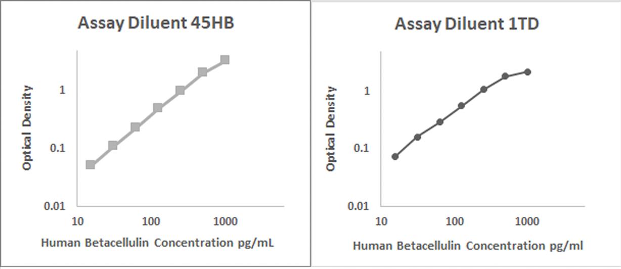 Human Betacellulin recombinant protein was spiked into various biological samples and serial diluted with Assay Diluent 45HB for serum and/or plasma samples and Assay Diluent 1TD for RPMI 10% FBS.