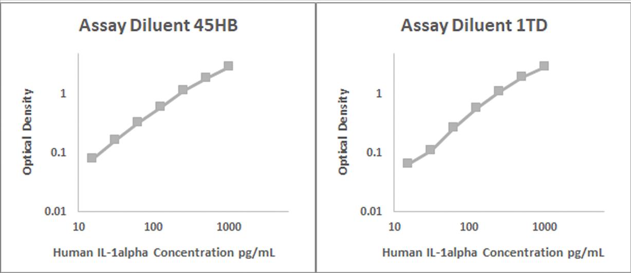 Human IL-1alpha recombinant protein was spiked into various biological samples and serial diluted with Assay Diluent 45HB for serum and/or plasma samples and Assay Diluent 1TD for RPMI 10% FBS.