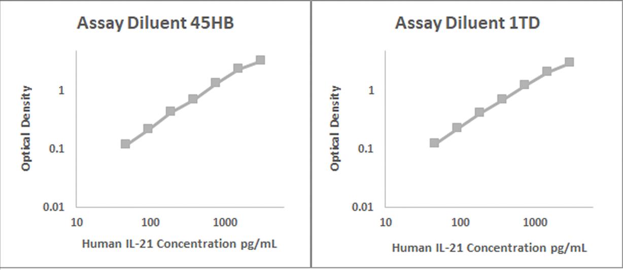 Human IL-21 recombinant protein was spiked into various biological samples and serial diluted with Assay Diluent 45HB for serum and/or plasma samples and Assay Diluent 1TD for RPMI 10% FBS.