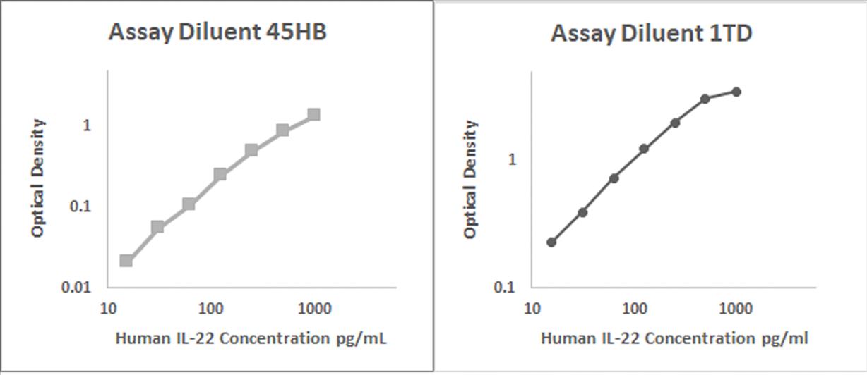 Human IL-22 recombinant protein was spiked into various biological samples and serial diluted with Assay Diluent 45HB for serum and/or plasma samples and Assay Diluent 1TD for RPMI 10% FBS.