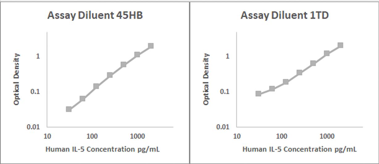 Human IL-5 recombinant protein was spiked into various biological samples and serial diluted with Assay Diluent 45HB for serum and/or plasma samples and Assay Diluent 1TD for RPMI 10% FBS.