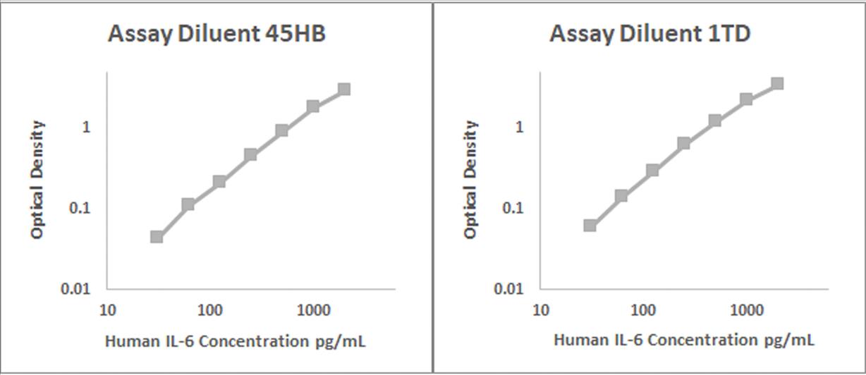 Human IL-6 recombinant protein was spiked into various biological samples and serial diluted with Assay Diluent 45HB for serum and/or plasma samples and Assay Diluent 1TD for RPMI 10% FBS.