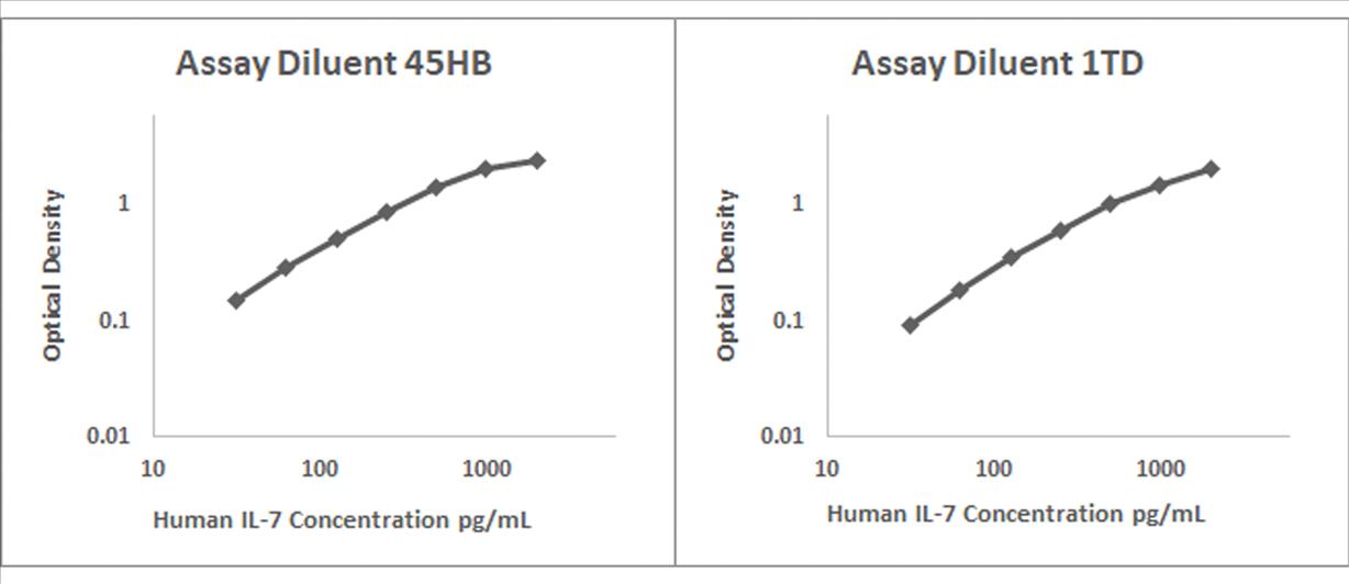 Human IL-7 recombinant protein was spiked into various biological samples and serial diluted with Assay Diluent 45HB for serum and/or plasma samples and Assay Diluent 1TD for RPMI 10% FBS.