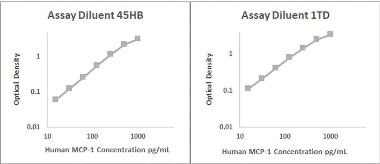 Human MCP-1 recombinant protein was spiked into various biological samples and serial diluted with Assay Diluent 45HB for serum and/or plasma samples and Assay Diluent 1TD for RPMI 10% FBS.