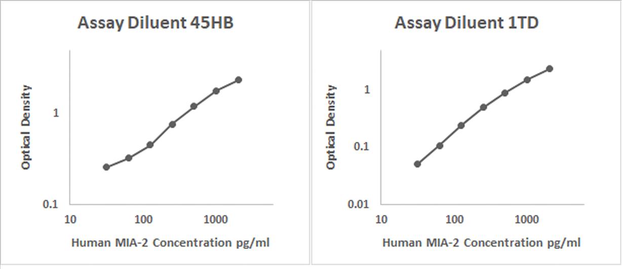 Human MIA-2 recombinant protein was spiked into various biological samples and serial diluted with Assay Diluent 45HB for serum and/or plasma samples and Assay Diluent 1TD for RPMI 10% FBS.