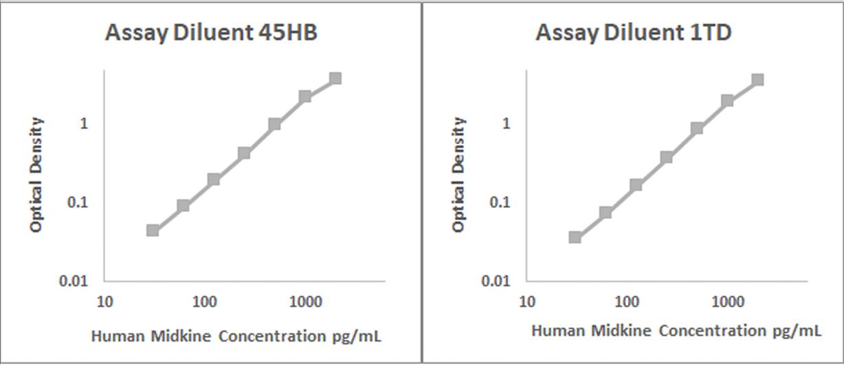 Human Midkine recombinant protein was spiked into various biological samples and serial diluted with Assay Diluent 45HB for serum and/or plasma samples and Assay Diluent 1TD for RPMI 10% FBS.
