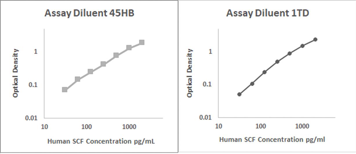 Human SCF recombinant protein was spiked into various biological samples and serial diluted with Assay Diluent 45HB for serum and/or plasma samples and Assay Diluent 1TD for RPMI 10% FBS.