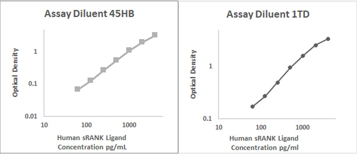 Human sRANKLigand recombinant protein was spiked into various biological samples and serial diluted with Assay Diluent 45HB for serum and/or plasma samples and Assay Diluent 1TD for RPMI 10% FBS.
