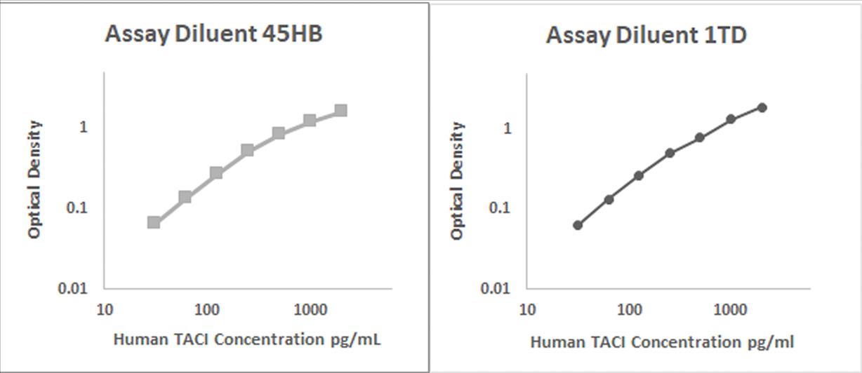 Human TACI recombinant protein was spiked into various biological samples and serial diluted with Assay Diluent 45HB for serum and/or plasma samples and Assay Diluent 1TD for RPMI 10% FBS.