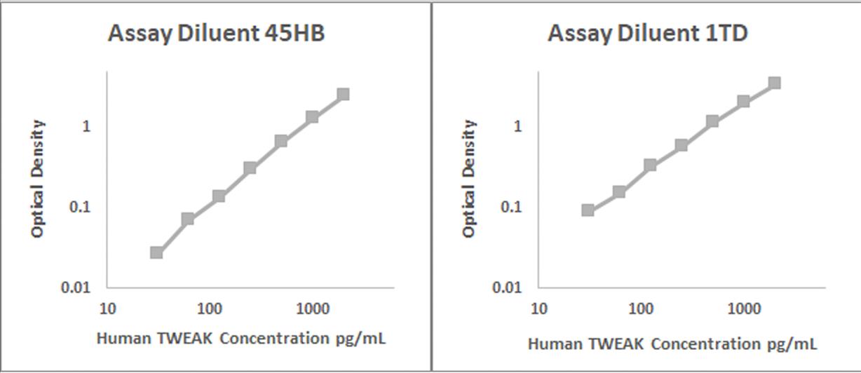 Human TWEAK recombinant protein was spiked into various biological samples and serial diluted with Assay Diluent 45HB for serum and/or plasma samples and Assay Diluent 1TD for RPMI 10% FBS.
