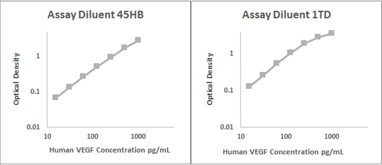 Human VEGF recombinant protein was spiked into various biological samples and serial diluted with Assay Diluent 45HB for serum and/or plasma samples and Assay Diluent 1TD for RPMI 10% FBS.