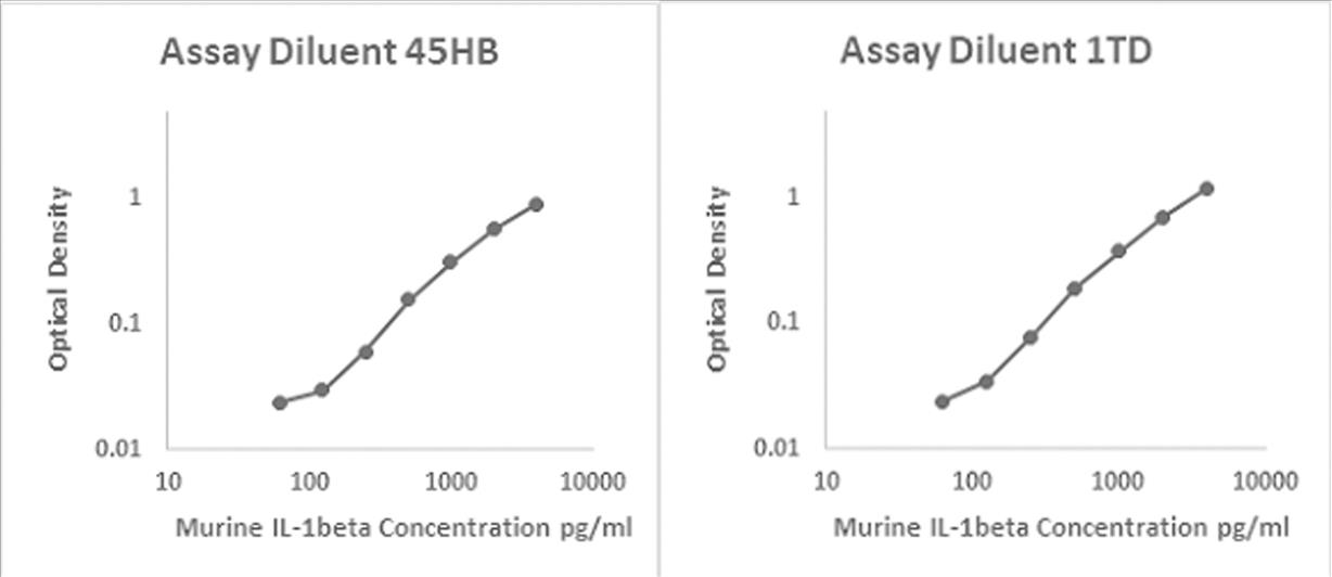 Mouse IL-1beta recombinant protein was spiked into various biological samples and serial diluted with Assay Diluent 45HB for serum and/or plasma samples and Assay Diluent 1TD for RPMI 10% FBS.