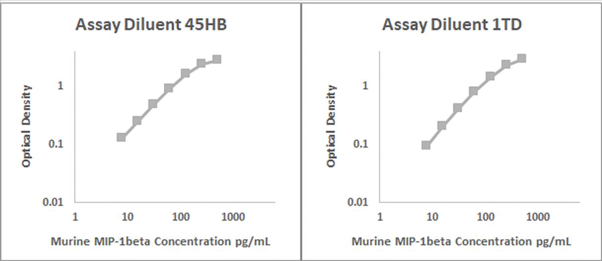 Mouse MIP-1beta recombinant protein was spiked into various biological samples and serial diluted with Assay Diluent 45HB for serum and/or plasma samples and Assay Diluent 1TD for RPMI 10% FBS.